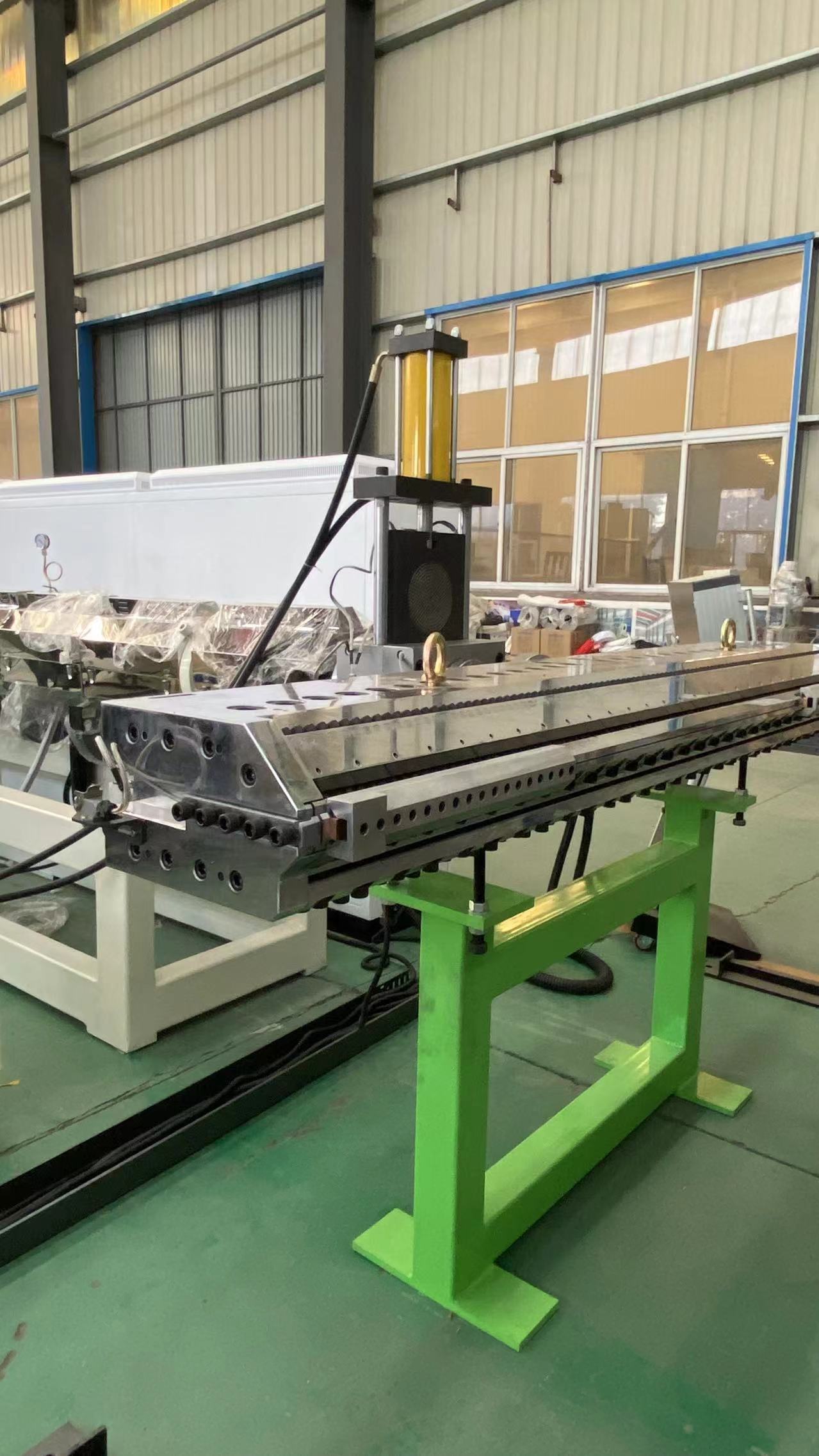 Ekoizpen lerroaKonposatuzko trokelaren buruak T formako egitura du eta P20 moldeko altzairuz egina dago, fluxu-kanalaren gainazala Ra 0,05 μm-ko zimurtasuna duena. Trokelaren buruak bederatzi berotze gune ditu, 27 kW-ko berokuntza-potentzia eta gehienez 1.300 mm-ko ekoizpen-zabalera ditu, PE estrusiozko nukleo-geruzaren lodiera eta lautasuna zehatz-mehatz kontrolatu ahal izateko. Hiru erroiluen kalandrak 500 × 1.500 mm-ko lan-azalera eraginkorra du. Linearen abiadura 0,5 eta 8 m/min arteko doikuntza zehatza izan daiteke ABB abiadura aldakorreko kontrol sistema erabiliz, xafla gainazal leuna bermatuz.