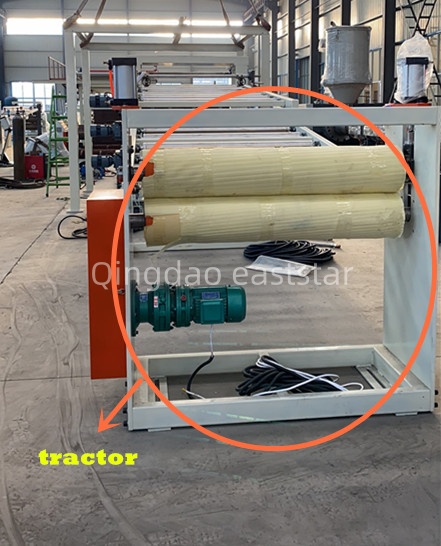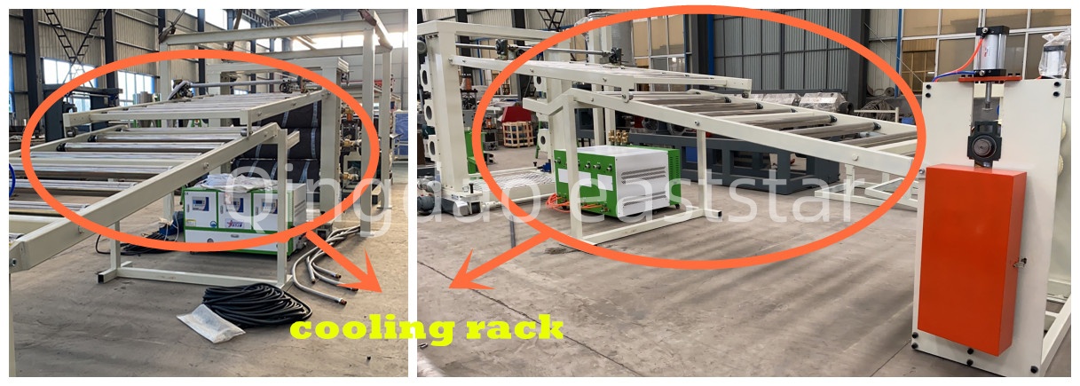 ekipatu duguABS geruza anitzeko ko-estrusio xafla ekoizteko lerroaelikadura eta sistema osagarri osoarekin. SJ-130 estrusoreak E-1000 altzairu herdoilgaitzezko torloju elikadura batekin hornituta dago, eta SJ-70 estrusoreak E-300 hutseko elikadura batekin hornituta dago, lehengai ezberdinen hornidura zehatza bermatuz. Hozte euskarria 8 metroko luzera duen altzairu herdoilgaitzezko arrabolez eta ertz erregulagarrizko hiru ebakitzailez hornituta dago, xafla nahikoa hoztea eta ertz garbiak bermatuz. Ebaketa-makinak zizaila elektriko mekaniko bat erabiltzen du, Korean Autonics kodetzaile batekin hornitua, luzera finkoko ebaketa automatikoa lortzeko.